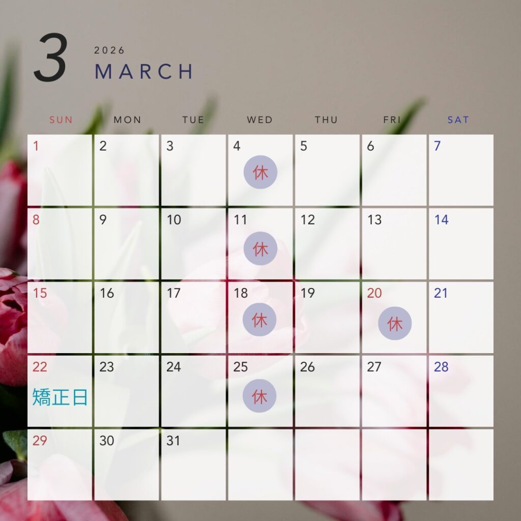 3月休診日と矯正日のお知らせ 2026.02.10 休診日:4(水)・11(水)・18(水)・20(金・祝)・25(水) 矯正日:22(日) 矯正日は矯正治療のみの受付となります。 2月休診と矯正日のお知らせ前の記事