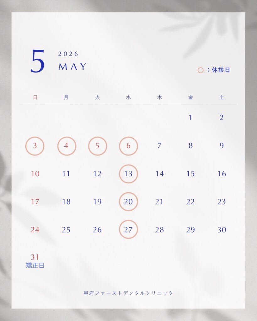 5月休診日・矯正日のお知らせ 2026.03.31 休診日:3(日)・4(月・祝)・5(火・祝)・6(水・祝)・13(水)・20(水)・27(水) 矯正日:31(日) ※矯正日は矯正治療のみの受付となります。 4月休診日・矯正日のお知らせ前の記事